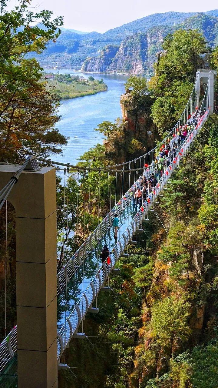 为了连接两座山峰,景区在藏龙湾修建了一梁玻璃栈道,双峰嵯峨间,这一桥飞架更显得气动山河。